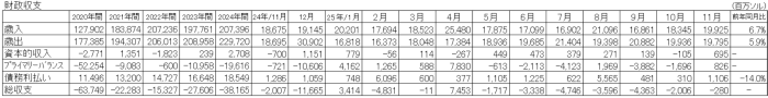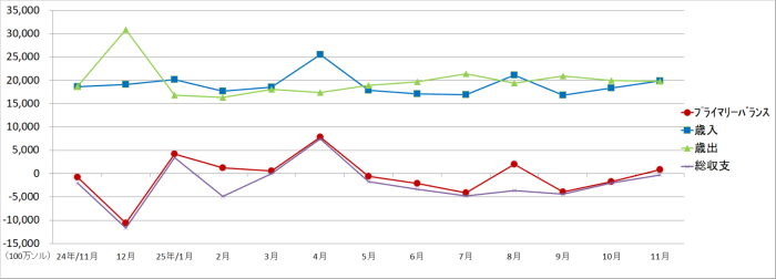 11月の政府全体の財政収支は、歳入が対前年同月比で6.7%増となり、歳出は同比で5.9%増となった。全体では、プライマリーバランスは約8億ソルの黒字となった。債務の利払いを含めると約3億ソルの赤字となった。