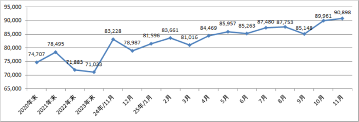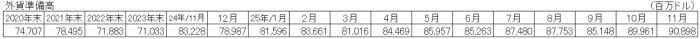 11月末の外貨準備高は約909億米ドルとなった。