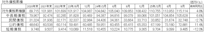 2025年9月末の対外債務累積総額は約1,151億米ドルとなった。
