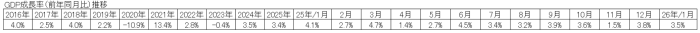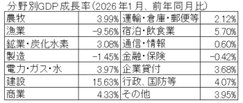 1月の経済成長率(GDP成長率)について、漁業、製造等の成長率はマイナスとなったが、建設、宿泊・飲食業等の成長率の高い伸びを反映して、全体としてGDP成長率は3.54%(前年同月比)となった。