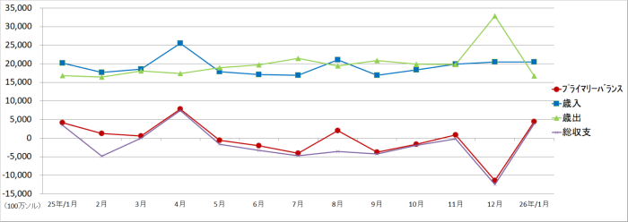 1月の政府全体の財政収支は、歳入が対前年同月比で1.3%増となり、歳出は同比で0.6%減となった。全体では、プライマリーバランスは約44億ソルの黒字となった。債務の利払いを含めると約39億ソルの黒字となった。